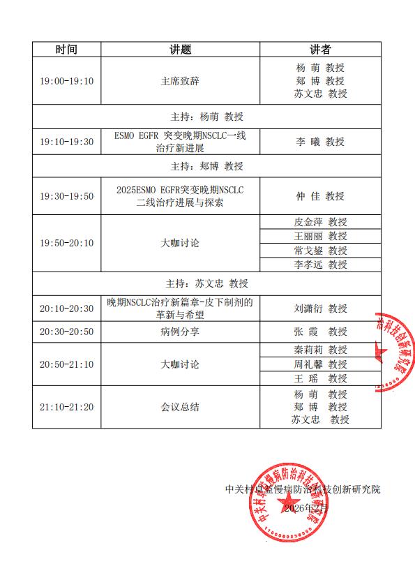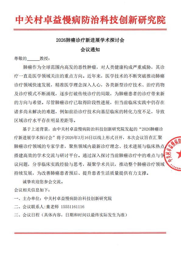 基于上述背景,由中关村卓益慢病防治科技创新研究院发起的“2026肺癌诊疗新进展学术探讨会”将于2026年3月16日以线上形式召开,本次会议旨在汇聚肺癌诊疗领域的专家学者,聚焦领域内最新诊疗理念、技术进展与临床热点,搭建高效的学术交流与研讨平台。通过深入探讨当前肺癌诊疗中的难点与争议问题,分享临床实践经验与思考,凝聚学术共识,推动整个肺癌诊疗领域持续发展,为改善肺癌患者预后、提升患者生活质量提供有力支撑。